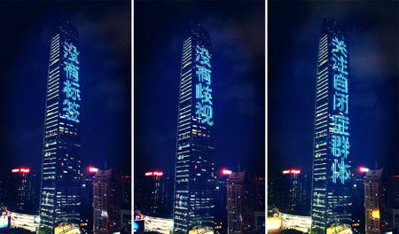 4月2日,由深圳市自闭症研究会、罗湖区民政局、深圳市社会福利基金会、壹基金、京基地产、深圳广电集团先锋898电台等数十家政府机构、公益组织、企业、媒体等携手举办的“没有标签 没有歧视 关注自闭症群体”慈善晚宴在罗湖区举办。深圳地标京基100大厦作为场外分会场,当晚20时点亮象征自闭症代表色的蓝灯。同日,包括京基100大厦、上海东方明珠、广州电视塔、武汉黄鹤楼等在内的世界上100多个国家、一万多处标志性建筑物同时变蓝,呼吁社会对于自闭症儿童的关注。