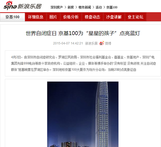 【新浪乐居】世界自闭症日 京基100为“星星的孩子”点亮蓝灯