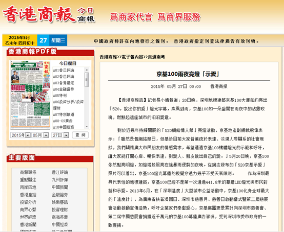 作為深圳最具代表性的地標建築,京基100已經不是第一次通過441.8米的幕牆LED燈光與市民對話和示愛。2013年6月,在「深圳溫度」大型城市公益活動中,京基100化身全球最大的「溫度計」,為廣東省扶貧濟困日、深圳市慈善月、慈善日啟動儀式暨第二屆慈展會活動啟動宣傳造勢,呼吁企業家們奉獻愛心,京基集團更是累計向深圳市慈善會、第二屆中國慈展會捐贈近千萬元的京基100幕牆廣告資源,受到深圳市委市政府的一致褒揚。