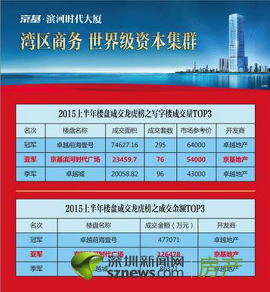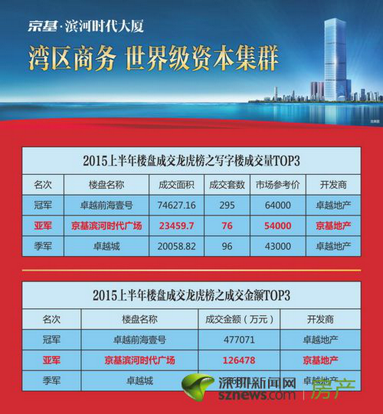 京基·滨河时代大厦入市以来,一直以成熟综合体商务配套、至优品质、立体交通等众多优势受到了众多企业家、投资者的亲睐,多次摘得深圳写字楼成交龙虎榜桂冠,2015年的京基滨河时代大厦延续2014的辉煌,销售成绩更是当红不让,不仅以7.1亿元的销售总金额摘取2015年第一季度全市写字楼成交金额冠军,上半年月月蝉联全深圳市写字楼成交前三甲。2015年上半年,项目更是以逾12.6亿元的总销售金额稳居福田区域在售写字楼销冠宝座。