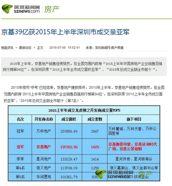 【深圳新闻网】京基39亿获2015年上半年深圳市成交量亚军