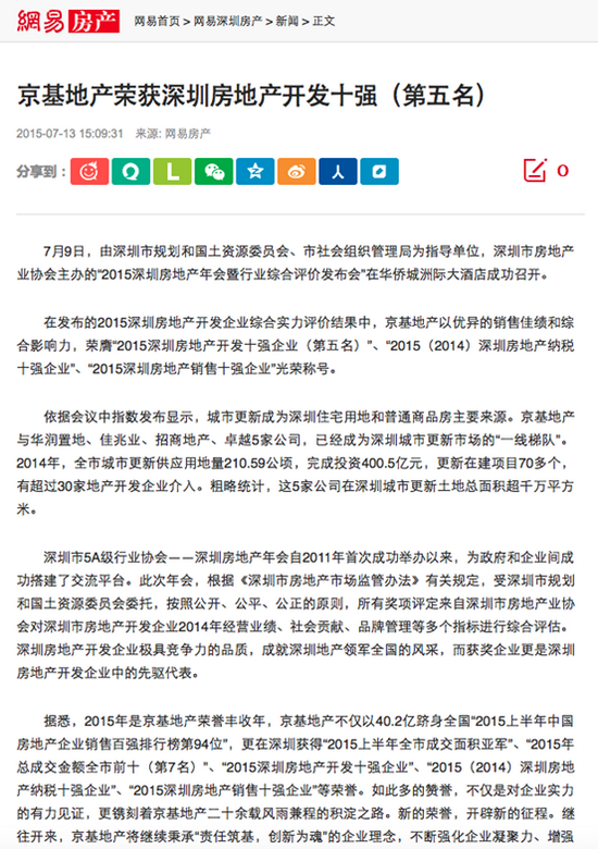 【网易】京基地产荣获深圳房地产开发十强(第五名)