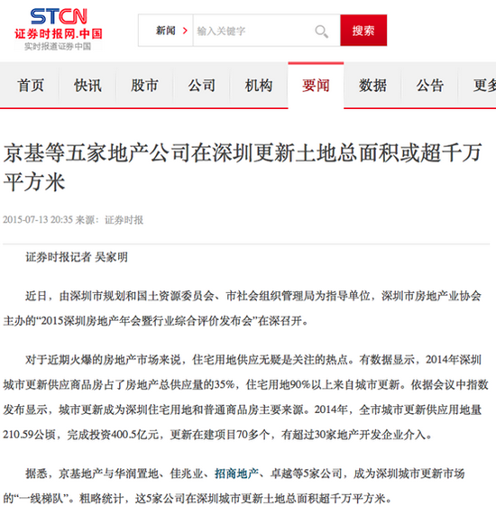 【证券时报】京基等五家地产公司在深圳更新土地总面积或超千万平方米